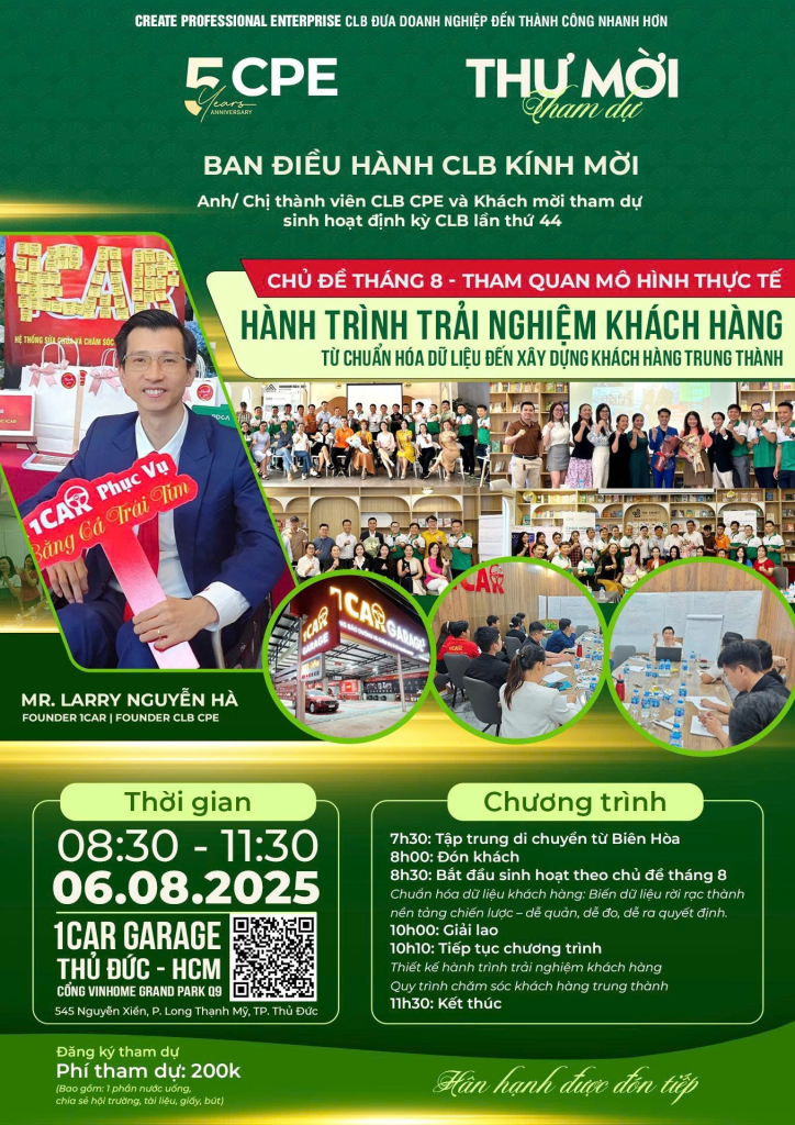 Trong hành trình kiến tạo doanh nghiệp bền vững, “trải nghiệm khách hàng” không còn là một khái niệm lý thuyết, mà là lợi thế cạnh tranh sống còn. CLB CPE trân trọng kính mời Anh/Chị tham dự buổi sinh hoạt tháng 8 – một chương trình đậm chất thực tiễn, tổ chức ngay tại 1CAR GARA, nơi khách hàng không chỉ được chăm sóc, mà được “chạm” vào cảm xúc!