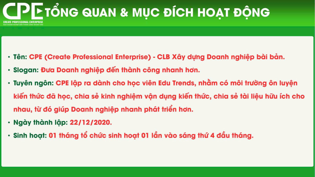 ❤️ Câu lạc bộ CPE -Create Professional Enterprise: Câu lạc bộ Xây dựng Doanh nghiệp bài bản.