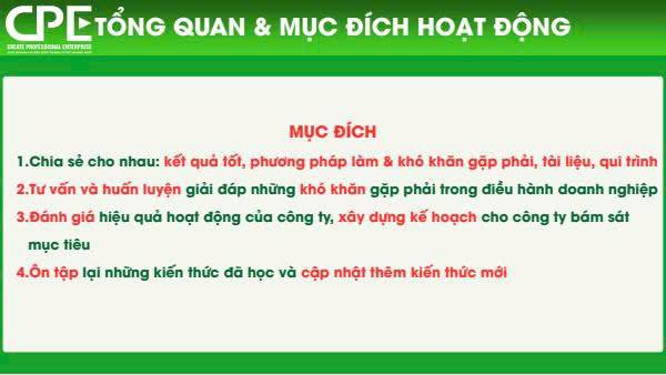 ✅ CPE là câu lạc bộ học tập. CPE không phải là câu lạc bộ trao/nhận cơ hội kinh doanh. Chúng tôi cùng nhau trao đổi kiến thức, hướng dẫn nhau cùng phát triển kinh doanh một cách bài bản.